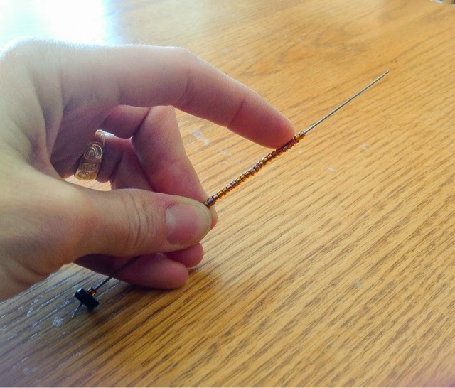 I bought this tool on Etsy, called the Fleegle beader. It is a long wire with a notch that allows you to preload about 40 beads at a time.